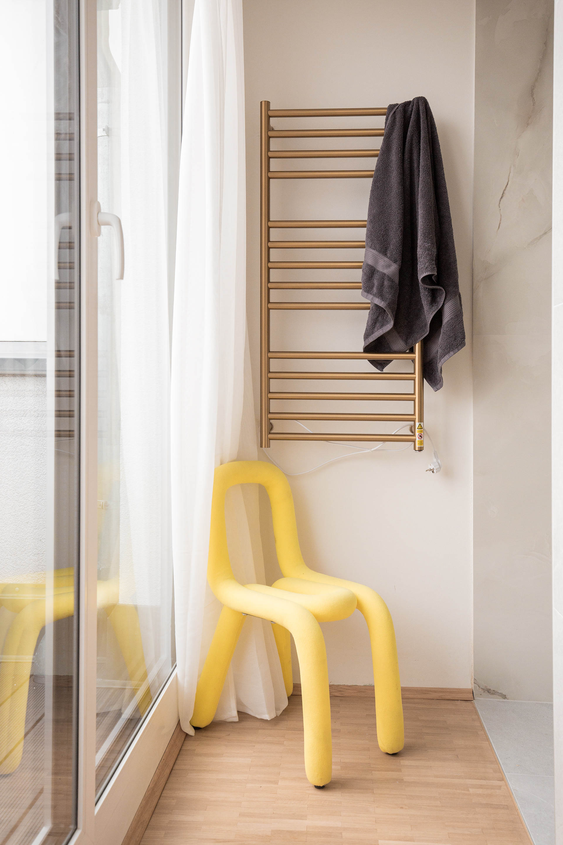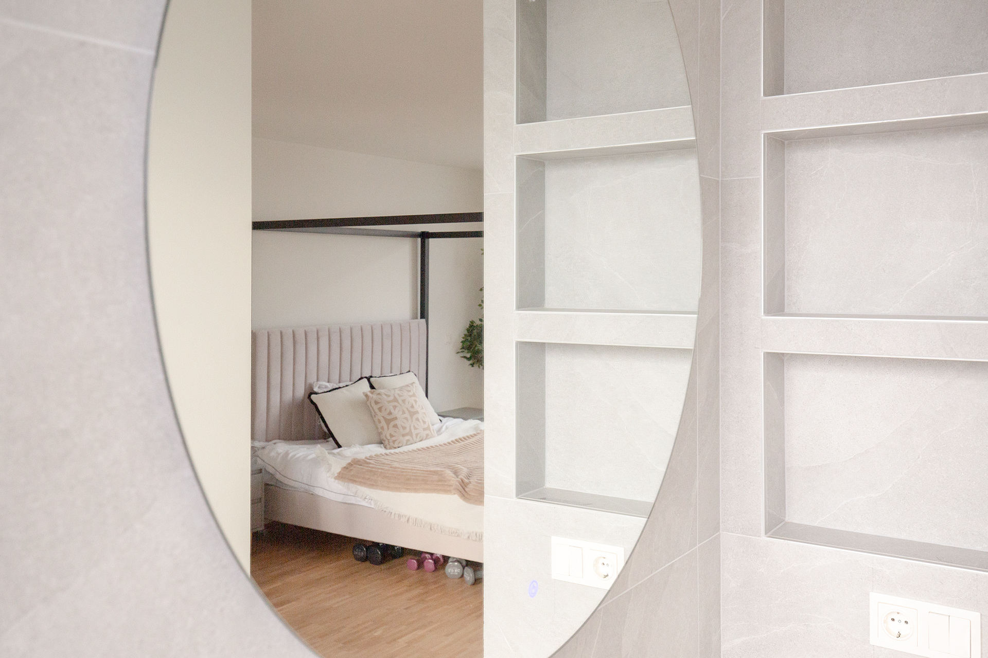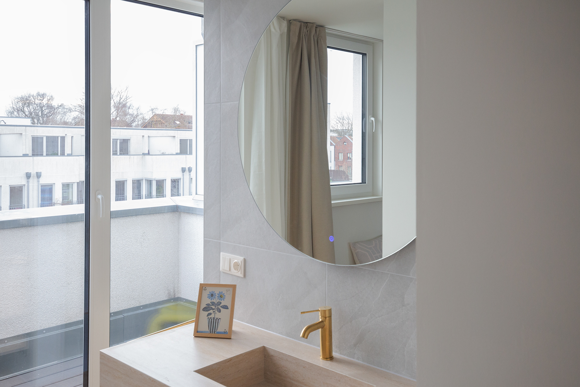 The bedroom opens onto an open-plan en-suite bathroom. The layout deliberately avoids conventional separations, allowing the shower and washbasin to remain visible and fully integrated into the room. This design choice creates a bright, contemporary space with a strong architectural character.