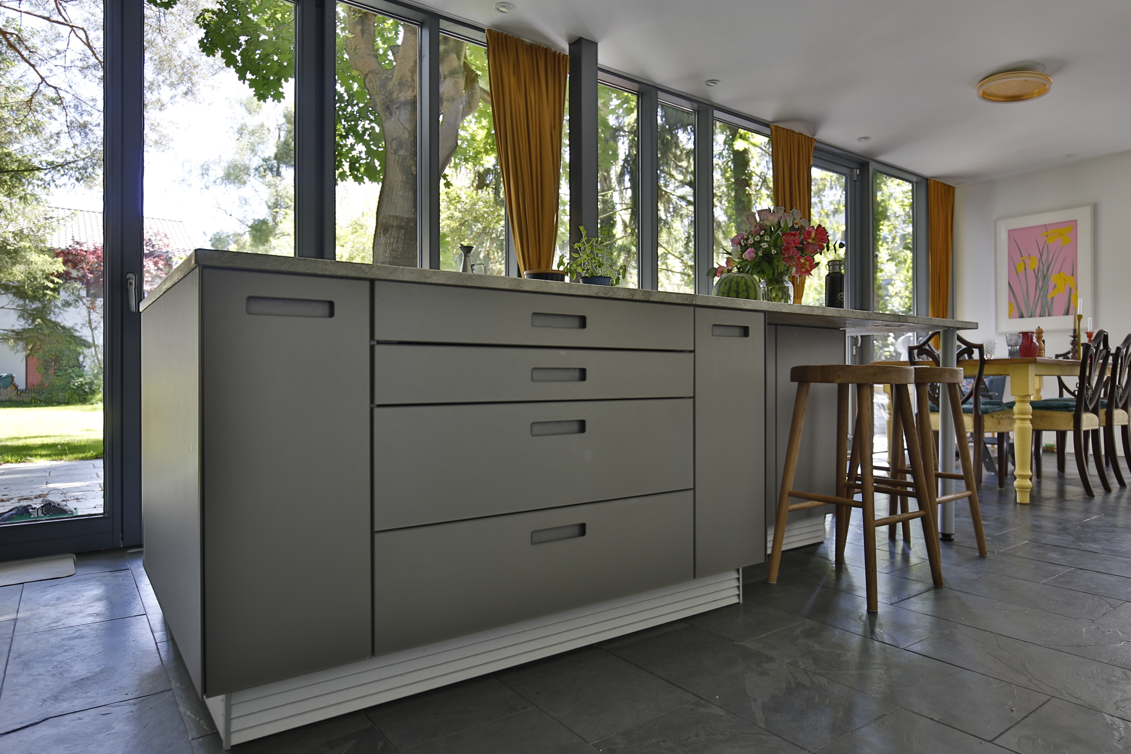 Des Weiteren wurde ein Anbau, in dem sich das Esszimmer befindet, zur Unterbringung der neuen Küche erweitert. Dabei wurde eine bestehende Bestandslücke gefüllt und die Glasfassade, von der man in den Garten schaut, verlängert. Vor und auf dem neuen Wintergarten-Anbau sind erweiterte Terrassenflächen geschaffen worden. Die Neuaufteilung der Innenräume nach den Bedürfnissen der Familie rundet die Gesamtmaßnahme ab.
