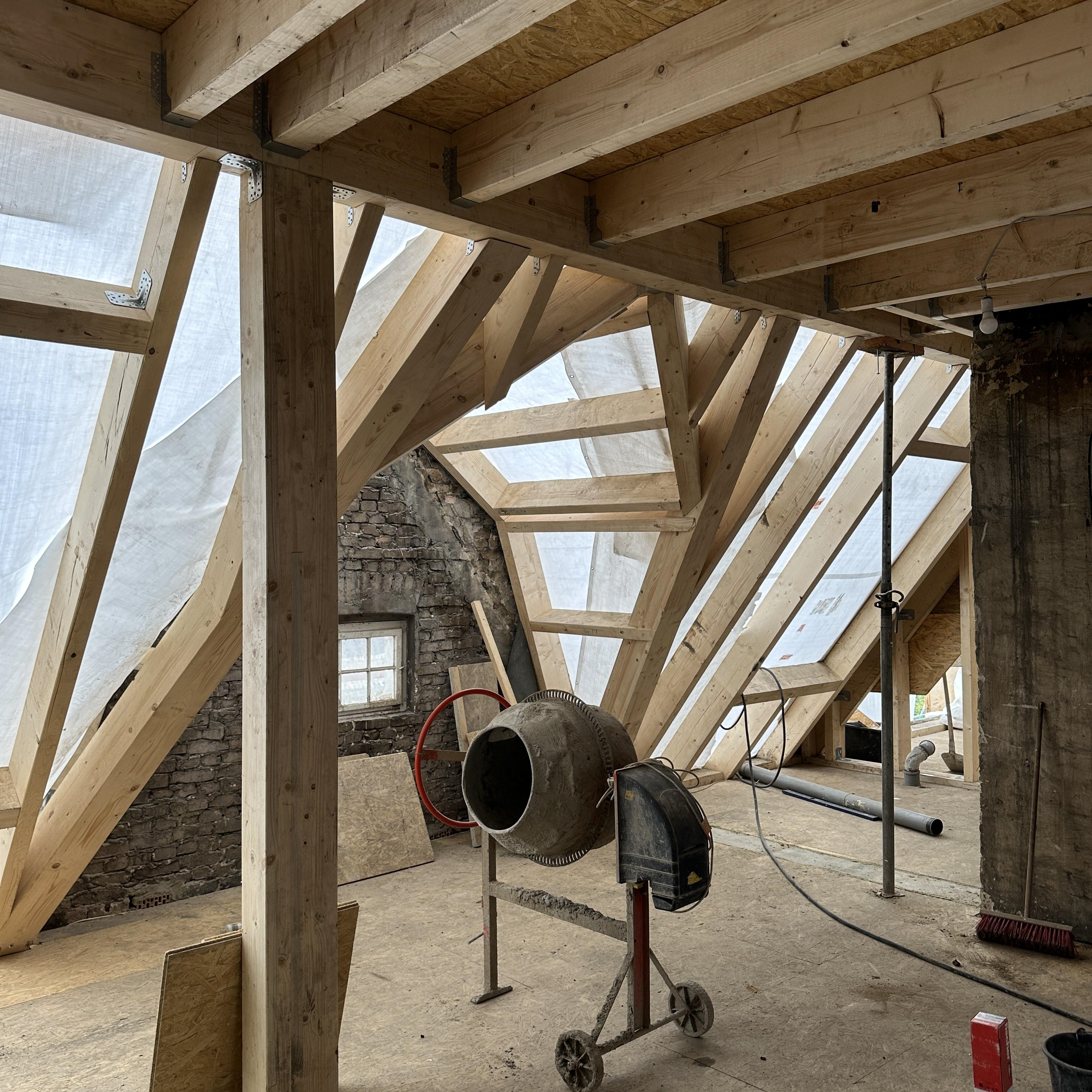 Mafeu Architekten erhielten den Auftrag einen Dachausbau zu planen. Die Oskarstraße liegt im Bezirk Lichtenberg und grenzt direkt an den Volkspark Wuhlheide. Das dreistöckige Wohnhaus steht wie viele Häuser in Berlin unter Denkmalschutz. Die Vorgaben des Denkmalamtes sahen vor die Dachkonstruktion genauso zu erhalten. Die Herausforderung bestand darin den Wohnraum effektiv und großzügig zu gestalten, ohne Teile der Dachkonstruktion umzubauen oder zu beschädigen. Die Lösung sah vor die Dachstützen als Raumbegrenzungen festzulegen und in den Wänden zu verkleiden. Die entstandenen Räume wurden dann sinnvoll eingeteilt, während auf einer Seite ein großer Wohnbereich geplant wurde, befinden sich in der anderen Wohnungshälfte vier Schlafräume.