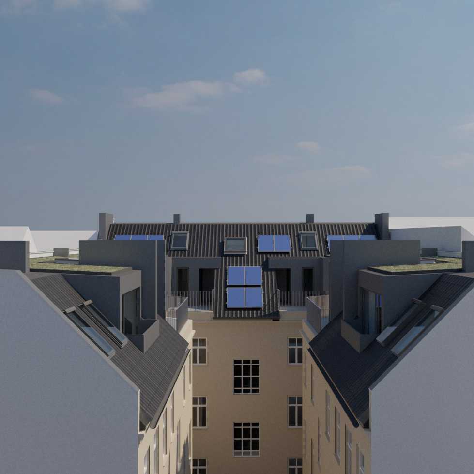 In einem Eckhaus in Prenzlauer Berg soll der Dachstuhl ausgebaut werden. MAFEU Architekten wurden mit der Planung beauftragt. Der Entwurf sieht vor, drei Wohnungen im Dachgeschoss unterzubringen. Jede Wohnung verfügt über eine Terrasse zur Straße hin, des Weiteren sind vier Gauben geplant um die Raumqualität gezielt zu optimieren. Die größte Wohnung ist ca. 100m² groß, aufgeteilt in drei Schlafräume, zwei Bäder und eine offene Wohnküche, eignet sich diese Wohnung gut für Familien. Die beiden kleineren Wohnungen haben ein sehr ähnliches Raumprogramm, bestehend aus einer offenen Wohnküche im Eingangsbereich und einem großzügigen Schlafzimmer. Um eine ausreichende natürliche Belichtung zu gewährleisten, wurden Oberlichter eingebaut, die verbleibenden Freiflächen auf dem Dach werden mit Photovoltaikanlagen belegt.