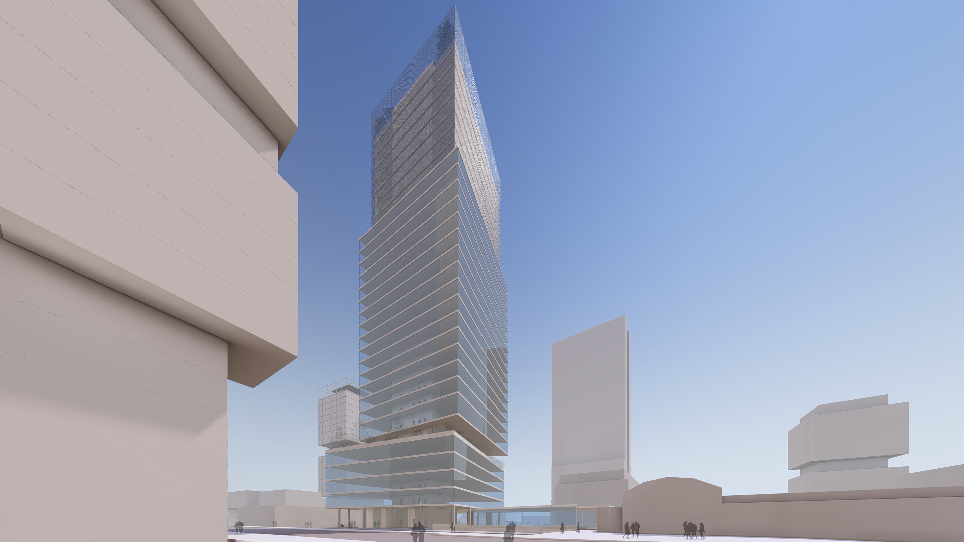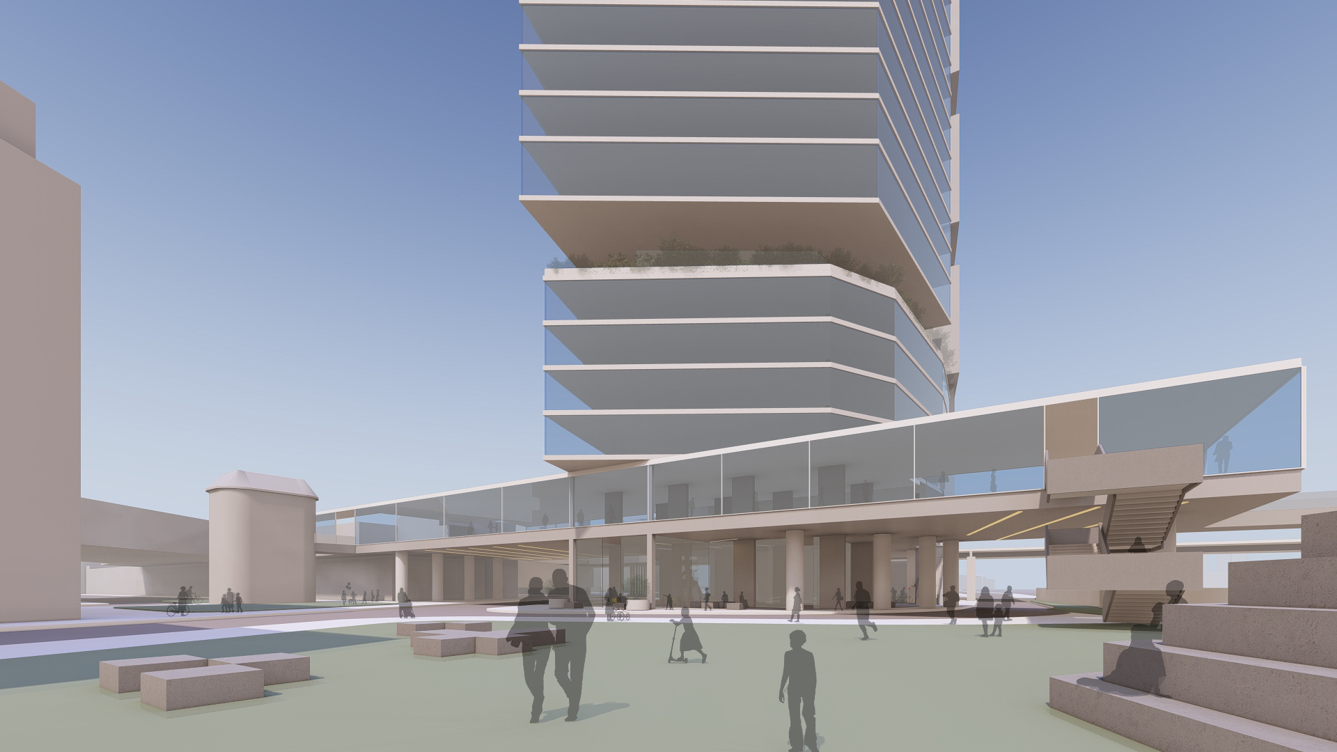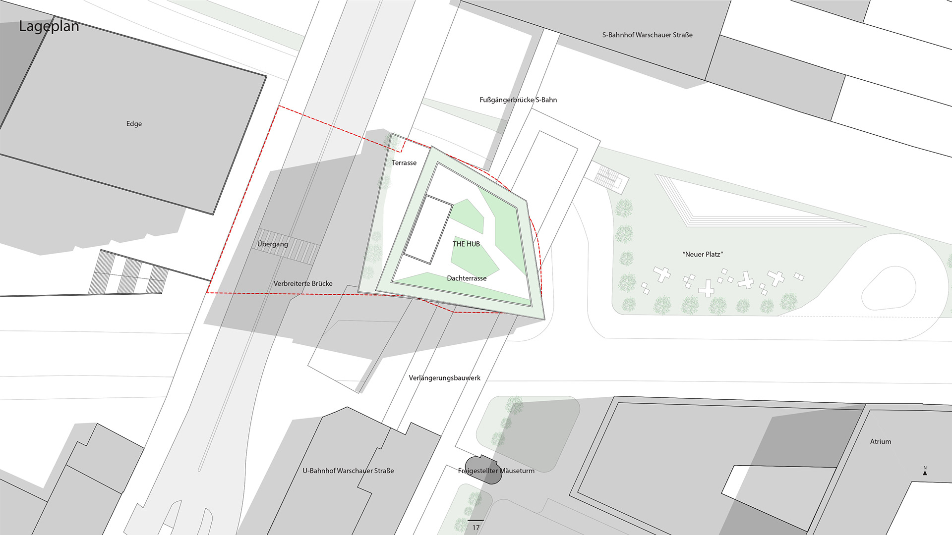 Entwickelt in Zusammenarbeit mit der COBE Berlin GmbH (Prof. Dr. Vanessa Carlow, Architektin und Stadtplanerin), reagiert The Hub auf die urbanen Herausforderungen von Mobilität, architektonischer Sichtbarkeit und Aufenthaltsqualität an einem der wichtigsten Verkehrsknotenpunkte Berlins. Das Projekt sieht ein multifunktionales Hochhaus vor, das in eine nachhaltige Mobilitätsinfrastruktur integriert ist und zwischen Friedrichshain und Kreuzberg liegt, wo es die S-Bahn- und U-Bahn-Stationen miteinander verbindet. Durch die Neuinterpretation des öffentlichen Raums verknüpft der Entwurf Fußgänger und Radfahrer über direkte Wege, erweitert sich über die Warschauer Brücke und integriert ein öffentliches Atrium mit Serviceeinrichtungen, Café, Ruhebereichen und Informationspunkten. Mit sorgfältig abgestuften Höhen zwischen 90 und 120 Metern, im Einklang mit dem Berliner Hochhausleitbild und in Dialog mit den benachbarten Denkmälern, zielt The Hub darauf ab, nicht nur die Skyline zu transformieren, sondern auch das städtische Gefüge zu aktivieren, die Lebendigkeit des Warschauer Platzes zu stärken und als Katalysator für das entstehende Quartier Rudolfband zu wirken.