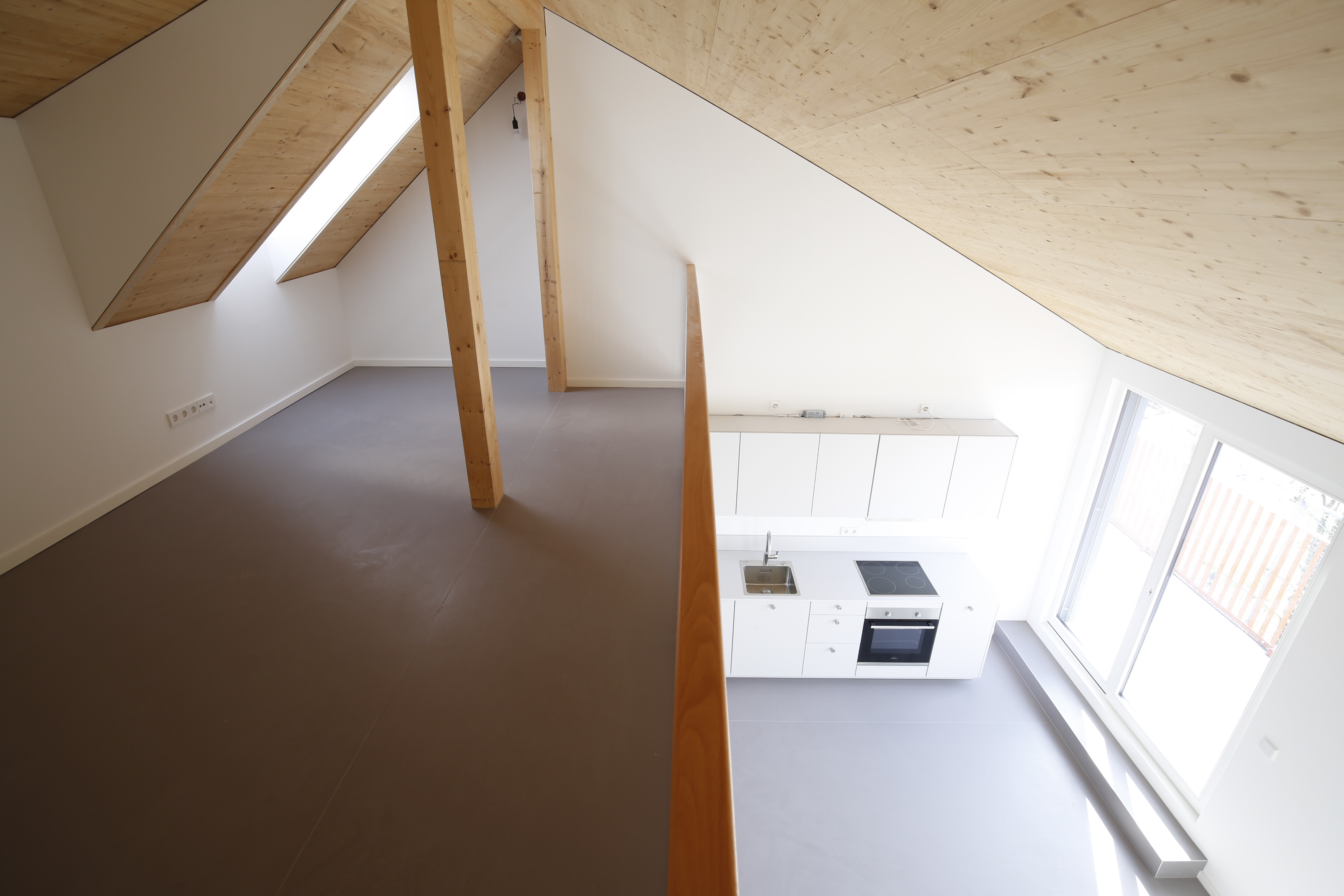 Das Projekt sieht die Schaffung von neun neuen Wohnungen mit einer durchschnittlichen Größe von je 50 Quadratmetern auf der Dachebene vor. Um das Dachvolumen optimal zu nutzen, wurde eine obere Galerie geschaffen, die intern durch eine Treppe verbunden ist; die beiden Ebenen sind volumetrisch Teil desselben offenen Raums, wodurch der Raum offener und heller wird. Die gesamte Struktur des neuen Daches wurde in Holz ausgeführt, einschließlich der Sparrenkonstruktion; ein Teil der Deckenausfachungen wurde freigelegt, um die natürliche Maserung des Holzes zu zeigen.