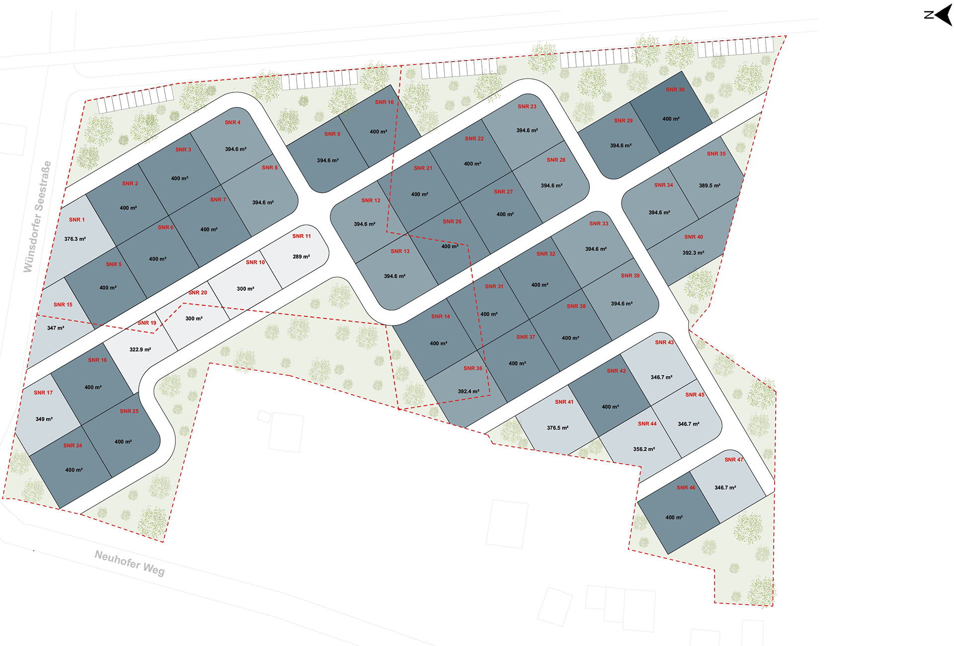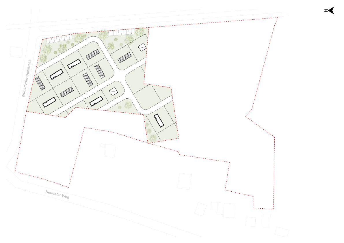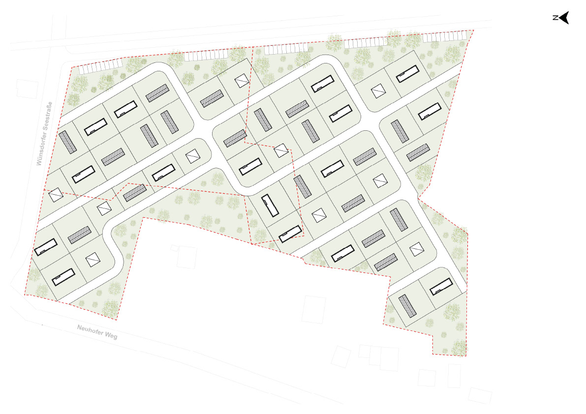 Besondere Aufmerksamkeit gilt der nördlichen Grundstücksgrenze entlang der Bahntrasse, wo Anordnung und mögliche Schutzmaßnahmen integraler Bestandteil der räumlichen Strategie sind. Das Ergebnis ist eine landschaftsorientierte, niedrig verdichtete Wohnstruktur, die kompaktes Wohnen mit einer sensiblen Einbindung in die natürliche Umgebung verbindet.