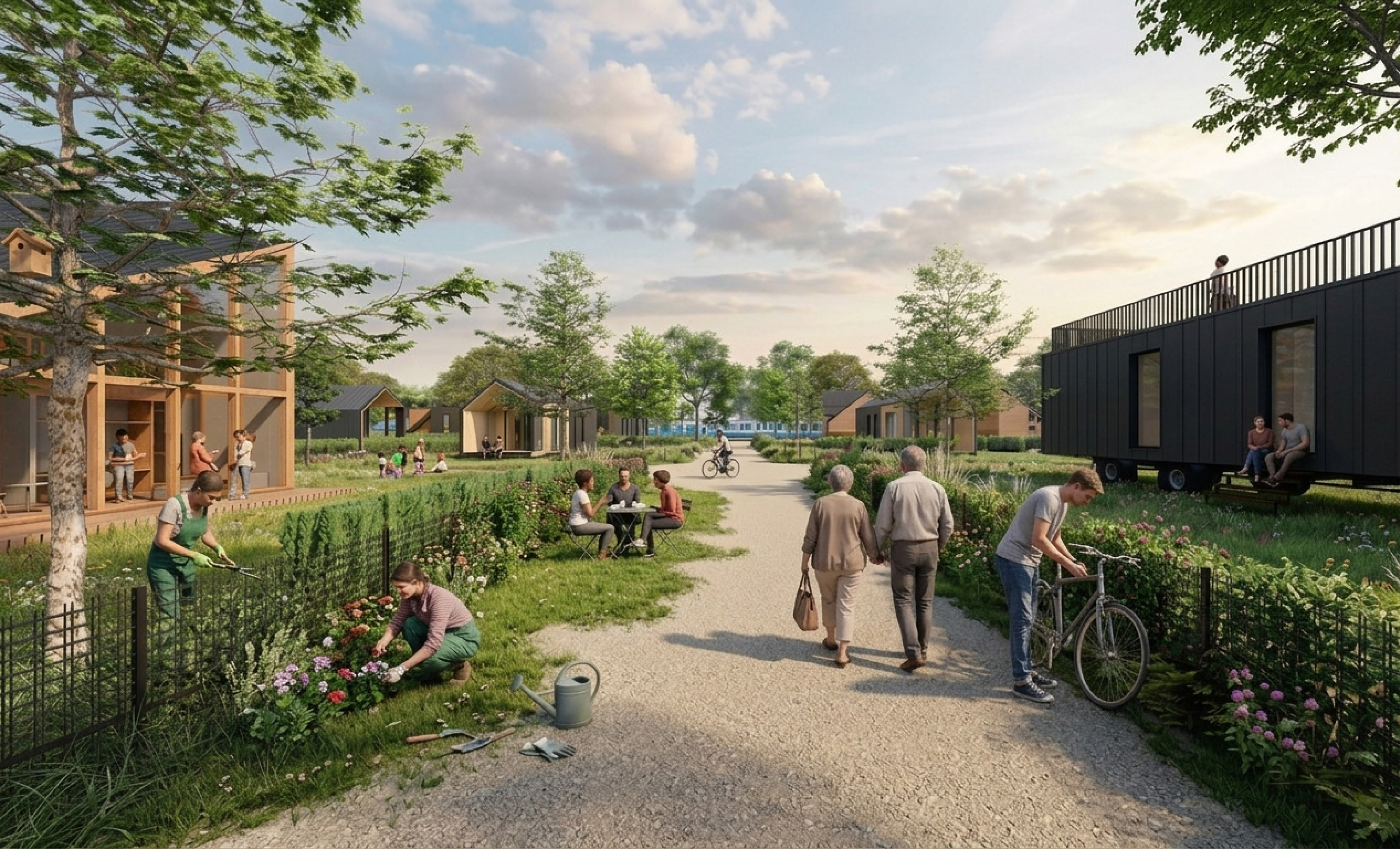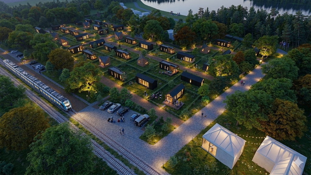 The proposal envisions a careful subdivision of the land into compact plots, creating the framework for small-scale residential typologies, including tiny houses and flexible holiday units. One- to two-storey structures are embedded within the existing green setting, prioritising orientation and a strong relationship between interior space and landscape.