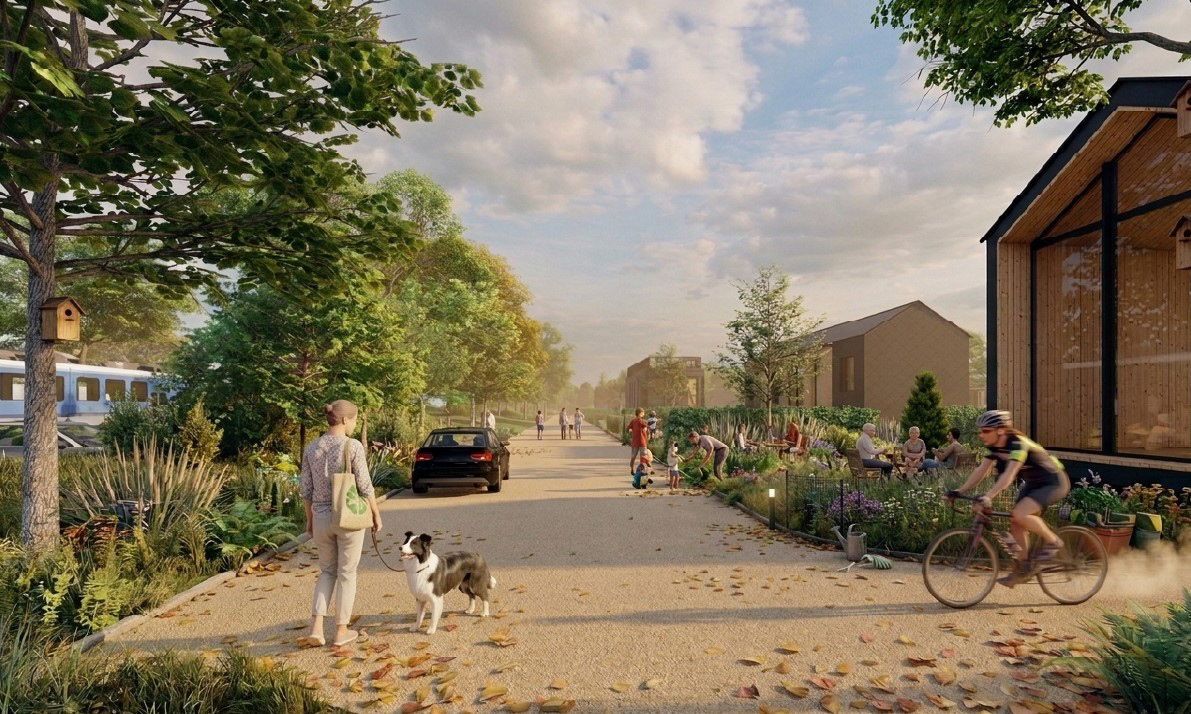 Special attention is given to the northern boundary adjacent to the railway line, where layout and potential protective measures are integrated into the spatial strategy. The result is a low-density, landscape-oriented development that combines compact living with sensitive integration into its natural surroundings.